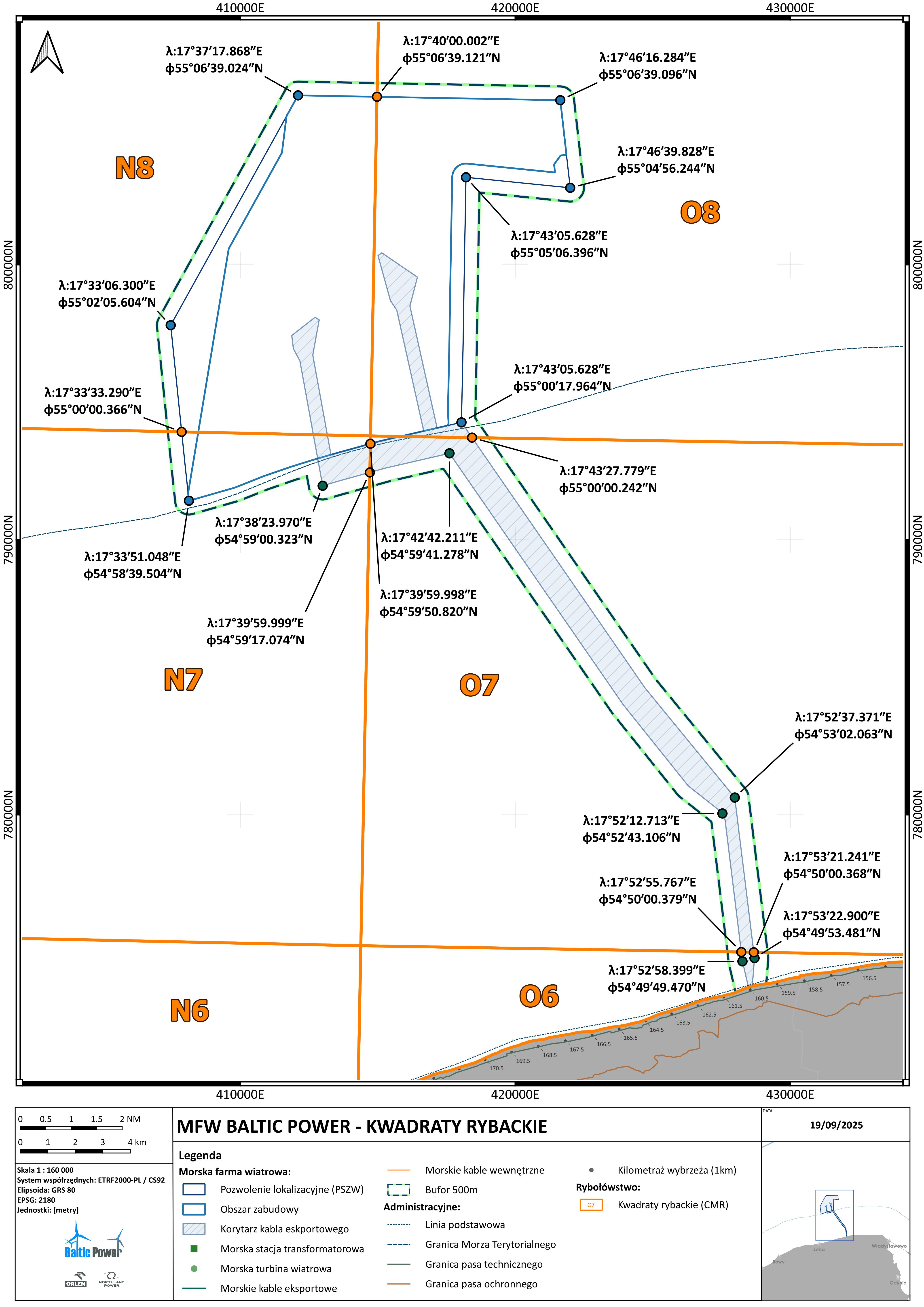 Baltic Power is located in the Polish Exclusive Economic Zone of the Baltic Sea, near Choczewo, approximately 23 to 34 kilometers offshore, covering an area of around 130 km². The infrastructure will partially overlap with fishing grid squares N7, N8, O7, and O8. The export cables transmitting energy to land will also pass through square O6. A total of 76 turbines will be installed, each over 200 meters tall and with a capacity of 15 MW, along with two offshore substations (OSS).