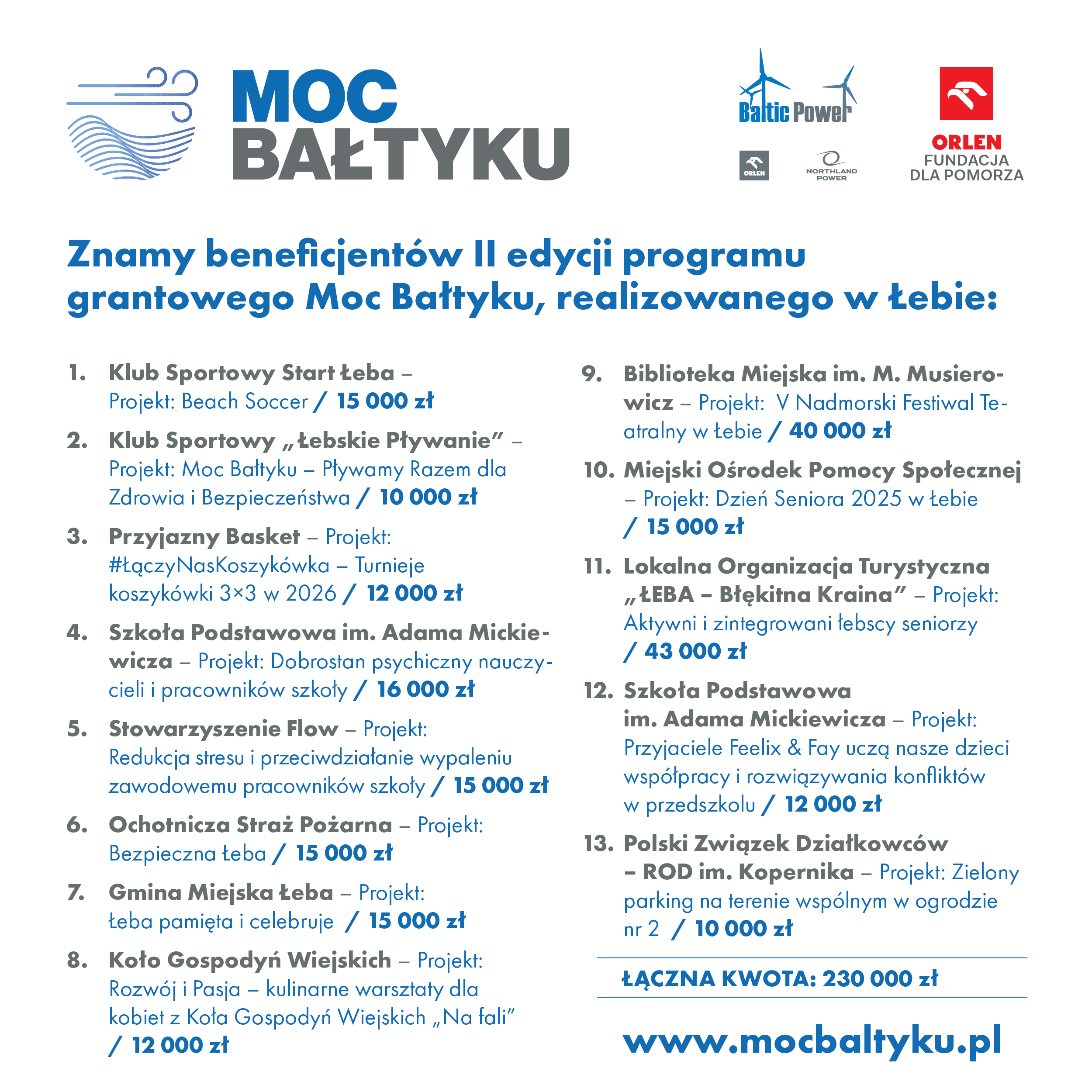 Trzynaście organizacji pozarządowych i instytucji z Łeby uzyskało dofinansowanie w ramach II edycji programu grantowego „Moc Bałtyku”, współorganizowanego przez Baltic Power i Fundację ORLEN dla Pomorza. Wsparcie otrzymały projekty sportowe, kulturalne, edukacyjne i poprawiające bezpieczeństwo mieszkańców. Łączny budżet tegorocznej edycji to 230 tysięcy złotych.
